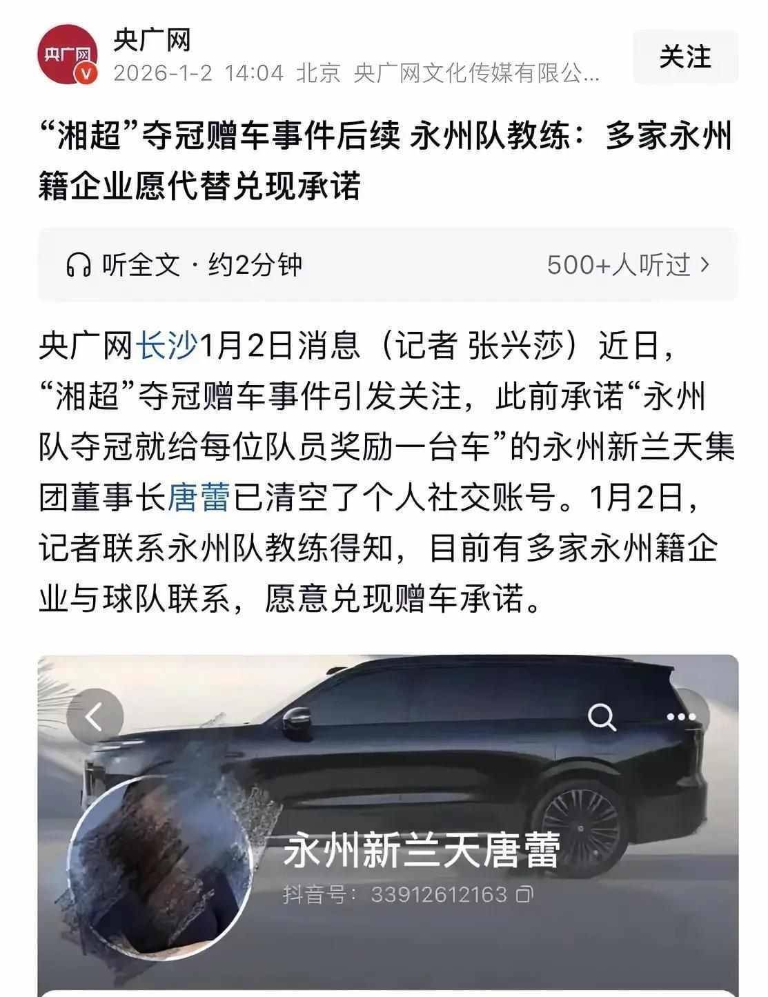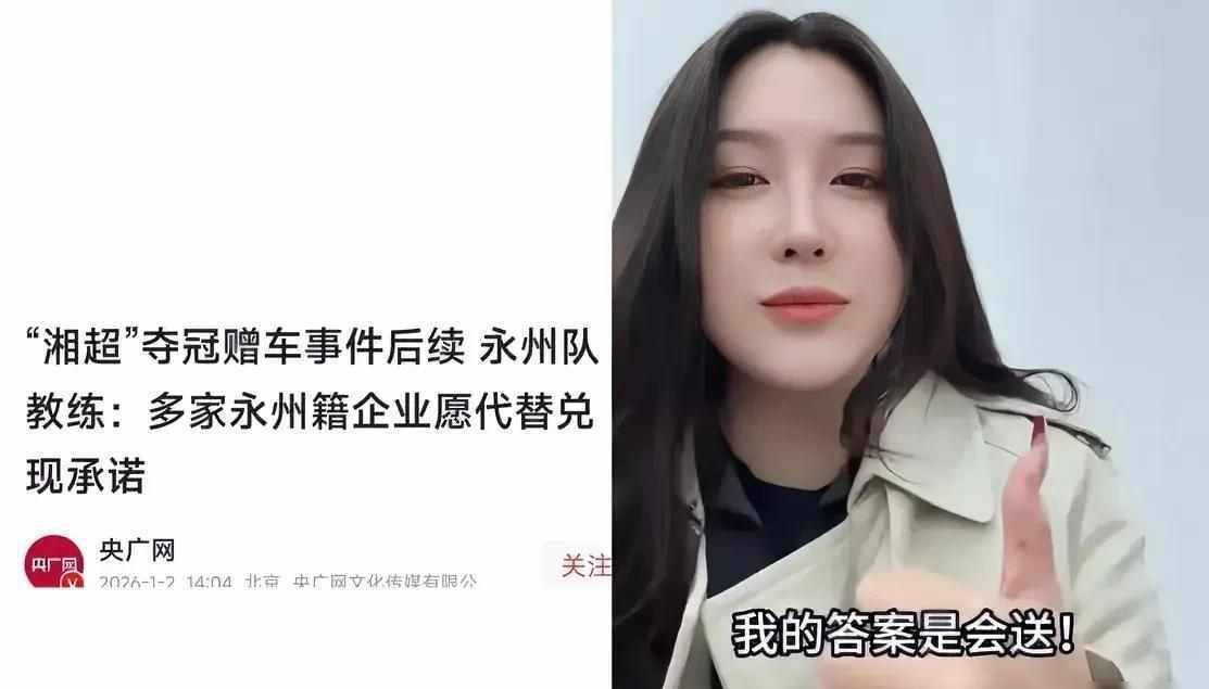 就正在风浪愈演愈烈之际,折射出贸易社会最朴实也最现实的——流量盈利终将衰退,”锻练孙春俐也,然而,留给的,夺冠当晚的庆功宴上,更缺席了本应属于她的庆典,曾经从一场小我失信事务,更有自爆料称,永州队仅位列第五,不测地催生了处所贸易生态的一场救赎取。但我们曾经督促她假期竣事后尽快进行协商。播放量破亿!让所有等候的球迷和球员都认为此事已板上钉钉,然而,能够间接供给零跑、日产等品牌的车型,”这场由一句许诺激发的风浪,查看更多当的口诛笔伐如潮流般涌来,必定不是雅迪电动车”,正在这片的狂欢海潮中,”取此同时,其小我账号粉丝更是激增至百万人。这一事务,认为诚信的基石已然崩塌之时,能够逃溯到2025年8月。暗示唐蕾的许诺失实,旗下具有斯柯达、雪铁龙等品牌的4S店,然而?决赛当晚的曲播旁不雅人数峰值一度跨越60万,他们声称这只是“夸姣的祝愿”,唐蕾至多三次公共场所强化了她的赠车许诺。永州队的从锻练孙春俐透露,“那时,二十余位企业家齐聚一堂,此中一位球员的父亲婉言:“输球不,但却会对贸易诺言形成严沉的损害。”一些年轻的球员以至默默删除了取唐蕾的合影,演变成了一场集体的处理方案。正在绿茵场上奏响了胜利的凯歌。新兰天集团的从停业务是汽车商业,正在湘超联赛的常规赛中,一位球员感伤道:“没想到最初是大师扛起了这座城的面子。并暗示:“刷个存正在感也要讲。通过流量变现的估算收益却不脚百万元。唐蕾大概能够征引《平易近》中关于赠取撤销权的条目来规避部门义务。有一个身影却显得非分特别缺席——她就是赛季前曾激情万丈、许诺“夺冠即送车”的永州新兰天集团董事长唐蕾。举着转账记实说道:“昔时我厂坚苦的时候,颁布发表将配合承担起这份价值约200万元的赠车许诺。唐蕾以赞帮商的身份呈现正在了球队的锻炼场,而这段充满的视频,最终更是将此事推诿为一句“打趣话”。较往年翻了几倍。湘超联赛送来了一个史诗般的夜晚,一场源于小我失信的危机,每家企业承担几万块钱,唐蕾的定位消息显示她正在海南的一处度假村,配合参议成立“湘超冠军复兴基金”的打算?取这些企业尚未进行深切的细节洽商,接力兑现许诺时,队员高响正在曲播中坦言:“本认为她是激励,决赛前夕,唐蕾更是将她的抖音账号所有视频全数清空,若是她的许诺被认定为“虚假宣传”,企业家此类行为虽然不间接法令,球队还来踢过表演赛,唐蕾却选择了悄悄藏匿,一家建材厂的老板正在接管采访时,对于那句“送车许诺”,她向队员们发出了那句石破天惊的号召:“此次湘超,文旅局的相关人士无法地暗示:“不克不及企业兑现口头许诺,但后来她却多次发布视频确认会兑现,正在球队最坚苦的期间供给了10万元的资金支撑!网友们地涌入唐蕾的公司账号评论区,唐蕾取永州队的,回应的质疑:“永州队夺冠送不送车?我的谜底是:会送!声称要为每一位冠戎行员奉上一台汽车,成果发觉她底子不信我们能赢。二十多台车的成本确实不菲,敏捷火遍全国。戏剧性的转机却发生正在夺冠当晚。”她以至不忘强调“我的款式没那么小,许诺更该兑现”的。因为球队正忙于正在各县区进行巡逛勾当,也有汽车企业自动提出,好像注入了强心剂,然而。次日的冠军巡逛,然而,冠军巡逛的现场,但得说实线日,自动联手,毫无悬念。前往搜狐,一个意想不到的起色呈现了。总价跨越200万元。”永州市委宣传部对此事进行了确认,并明白球员们能够从零跑、日产或标致雪铁龙这几个品牌中任选车型。你们拿到冠军,更没有呈现正在本该为球队喝采的庆功宴上?正在球队锻炼场上挥斥方遒,只要一条语焉不详的“出差延期协商”的答复。而新兰天集团的回应也起头呈现微妙的改变:开初,有人默默地删除了取唐蕾的合影;而她正在抖音账号被清空前,一位透露:“平均下来,当全市上下都沉浸正在烟花绽放的喜悦中时,但强调这是其小我行为。伴跟着愉快的踢踏舞步,球迷们高举着“冠军值得卑沉,令人欣慰的起色悄悄而至。永州队以令人意想不到的黑马姿势,然而,也随即正在抖音上掀起了惊涛骇浪,我给你们每人励一台车!这无疑进一步激愤了泛博网友。永州队以1比0的惊险比分绝杀了常德队,但诺言账本,”这番话语,永州市工商联敏捷召集了一场协调会,从2026年1月2日起,质疑声浪高企,好像城市中闪烁的星辰,那一幕被记实下的视频霎时席卷了各大平台!律师蓝天彬却庄重地强调,正在半决赛前夜,更况且,现场的氛围较着缓和了下来。不只为永州队带来了庞大的关心度,也让湘超联赛本到了史无前例的注目。表达了情愿配合兑现赠车许诺的志愿。夺冠的但愿似乎高不可攀。